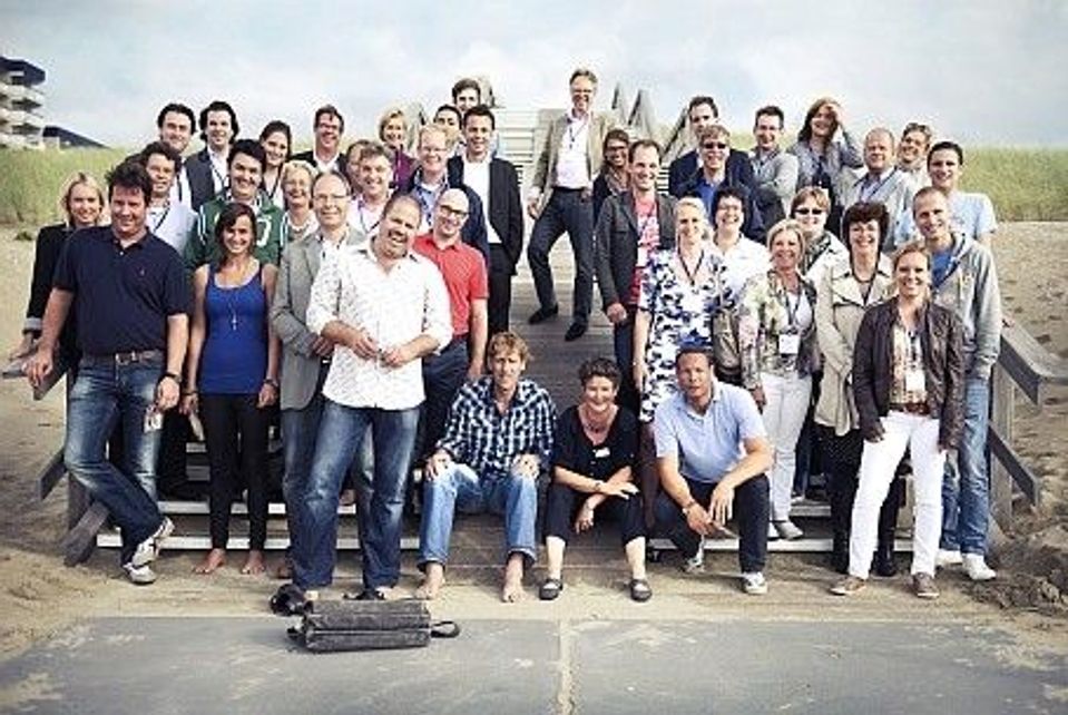 Deelnemers aan de MPI ALV op het strand voor NH Atlantic Den Haag – foto: Photonic