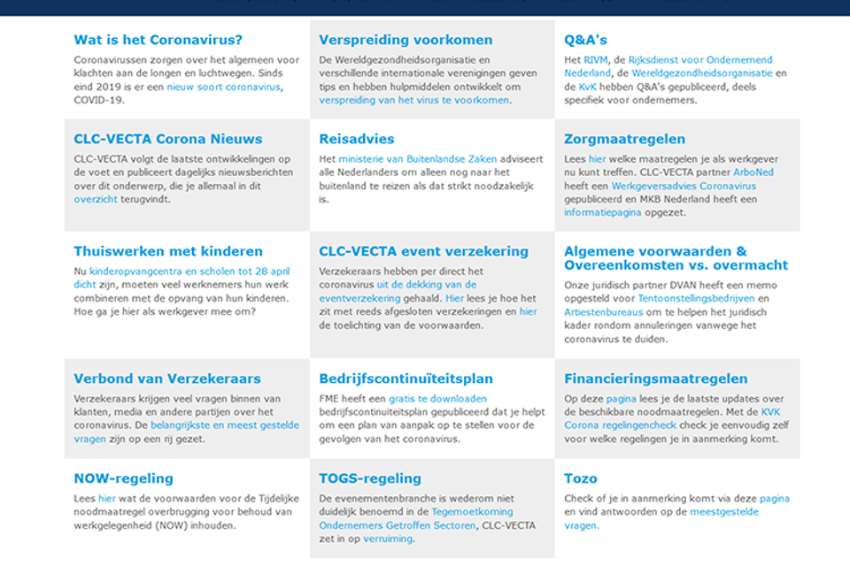 Zo is er een vraag- en antwoord rubriek op basis van veelgestelde vragen die zijn binnengekomen bij de Verbond van Verzekeraars en wordt uitleg gegeven over het beleid van de eigen eventverzekering van CLC-Vecta. Juridisch partner DVAN heeft een memo opgesteld voor Tentoonstellingsbedrijven en Artiestenbureaus met uitleg over overmachtclausules in algemene voorwaarden en overeenkomsten.